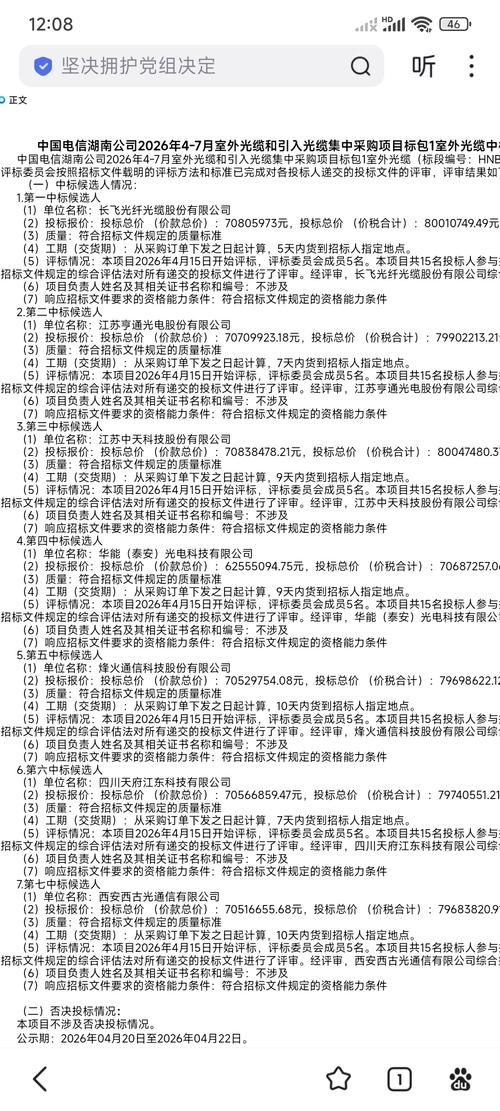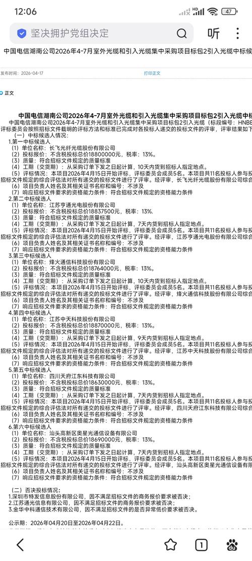 $中天科技(SH600522)$中国电信湖南公司2026年4-7月室外光缆和引入光缆集中采购项目标包1室外光缆中标候选人公示 中国电信湖南公司2026年4-7月室外光缆和引入光缆集中采购项目标包1室外光缆(标段编号:HNBBFA202603200014)评标委员会按照招标文件载明的评标方法和标准已完成对各投标人递交的投标文件的评审,评审结果如下: (一)中标候选人情况: 1.第一中标候选人 (1)...