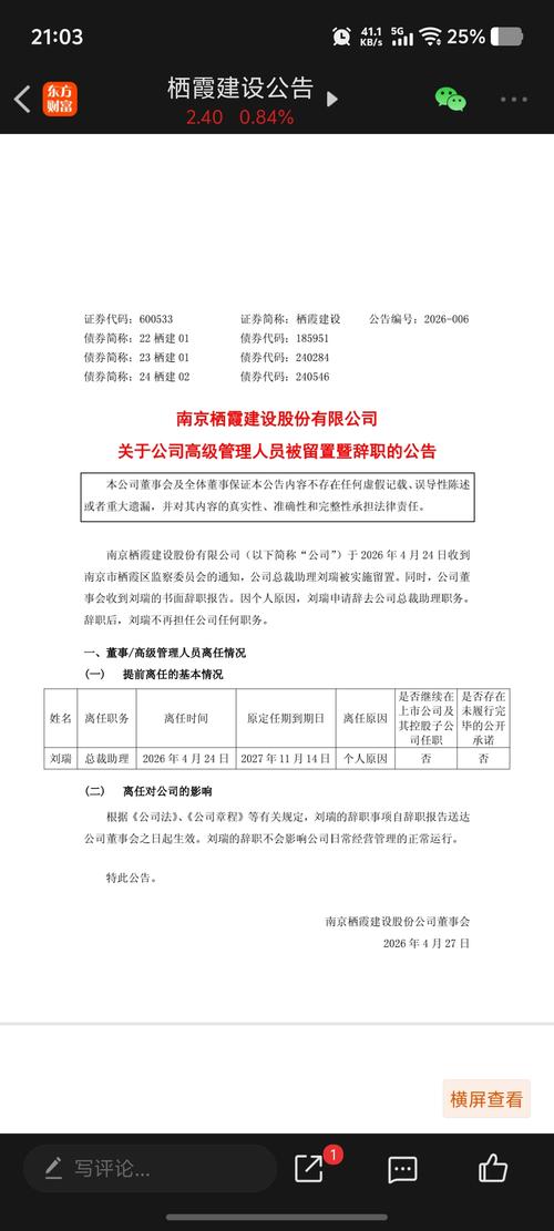 资讯 栖霞建设:总裁助理刘瑞被留置并辞职