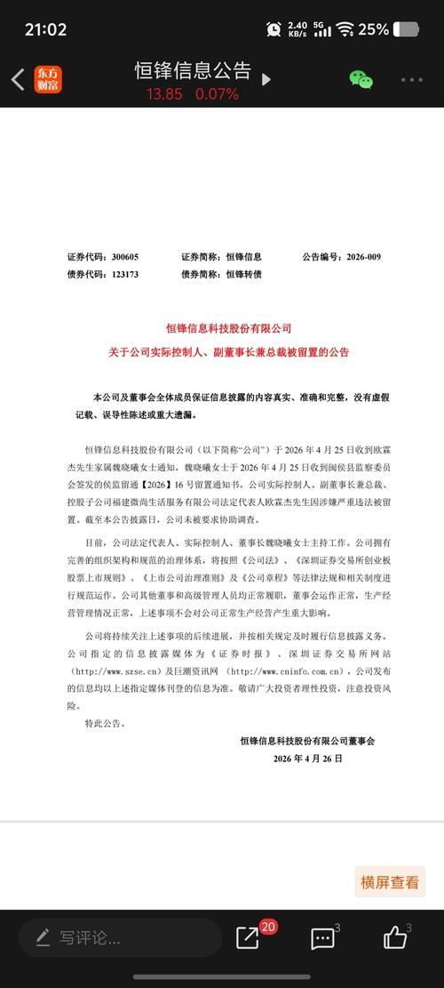$恒锋信息(SZ300605)$公司实际控制人、副董事长兼总裁、控股子公司福建微尚生活服务有限公司法定代表人欧霖杰因涉嫌严重违法被留置。 这个"严重违法",这四个字来看,犯的事不轻。。 但没有要求公司协助调查。大概就是个人原因。 但作为公司实控人,总裁,副董事长,直接参与公司的所有战略决策与管理!肯定是利空无疑。 接下来,市场信心也会受到重挫。股价当然也会跟着波动。 因为是利空,星期一下跌已不可避...