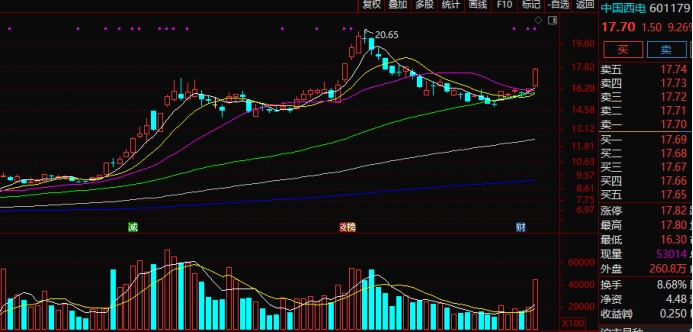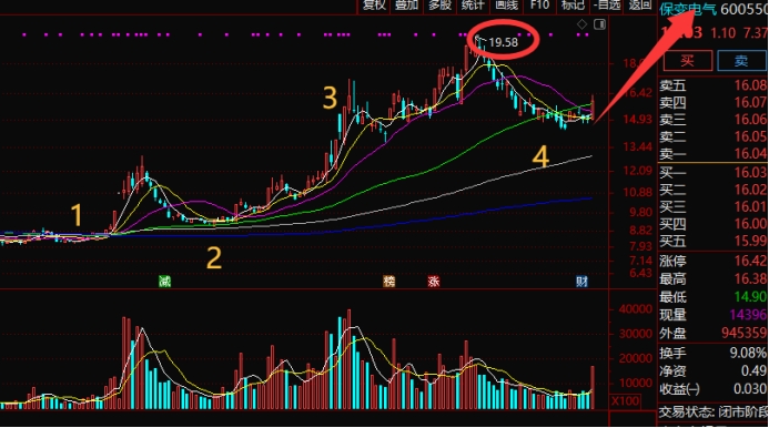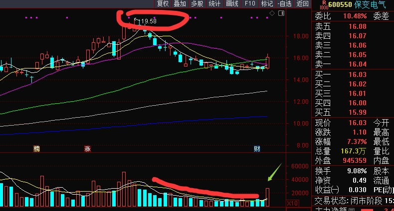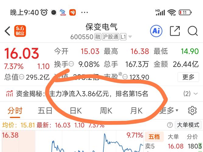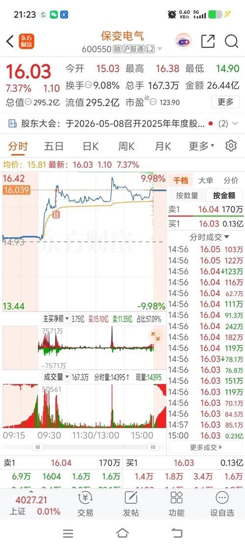 晚间话保变电气:今日回顾与明日展望 今日回顾:早盘15.03元开,最高冲至16.38元,最低下探14.90元,最终收盘16.03元,上涨1.10元,涨幅7.37%,单日振幅9.91%,股价全天运行区间集中在14.90-16.38元。全天成交量167.3万手,成交额26.44亿,换手率9.08%,量比2.77,资金活跃度较前一交易日有所提升;委比10.49%,买盘力量稍占优势,内盘成交71.74万手...