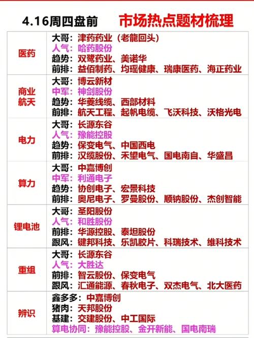 4.16周四盘前市场热点题材梳理全解析A股短线题材情绪梳理,核心是帮交易者快速定位各热门板块的龙头、人气标的和梯对结构。