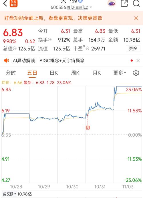 $天下秀(SH600556)$ 属广告营销板块,叠加网红经济、AIGC、宇宙等概念,是A股红人新经济龙头。核心WEIQ平台连接20万+商家与350万+红人,打通多平台API接口。海外设多区域办公室服务头部出海品牌。 从技术分析角度观察当前属于整理形态突破走势,K线大阳突破整理区间,均线系统由年线提供整理整理支撑,短线加速多头排列初期阶段,macd当前在零轴上方二次金叉,红柱加速延申。