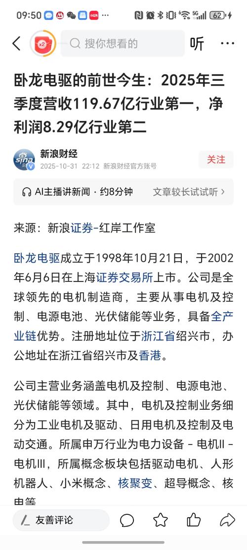 $卧龙电驱(SH600580)$卧龙电驱:以电机技术为基开拓机器人与低空经济新赛道 全球防爆电机市场占有率第一的背后,是一家中国企业对技术创新的持续深耕与对未来产业的精准卡位。 卧龙电驱成立于1984年,作为全球领先的电驱动系统解决方案提供商,公司已从单一的电机产品供应商发展为覆盖防爆、工业、暖通、新能源交通和机器人组件五大核心业务的综合性企业。 据最新数据显示,卧龙电驱在全球防爆电驱动系统解决方...