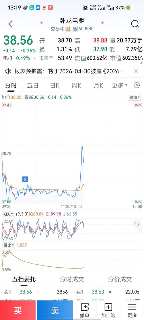 晚间话卧龙电驱:今日回顾与明日展望 今日回顾:早盘38.70元开,最高冲至38.88元,最低下探37.98元,最终收盘38.34元,下跌0.93%,单日振幅2.33%,股价全天运行区间集中在37.98-38.88元。全天成交量29.87万手,成交额11.44亿,换手率1.92%,量比0.93,资金活跃度较前一交易日回落;委比27.58%,买盘力量占优,外盘成交14.35万手,内盘成交15.52万手...