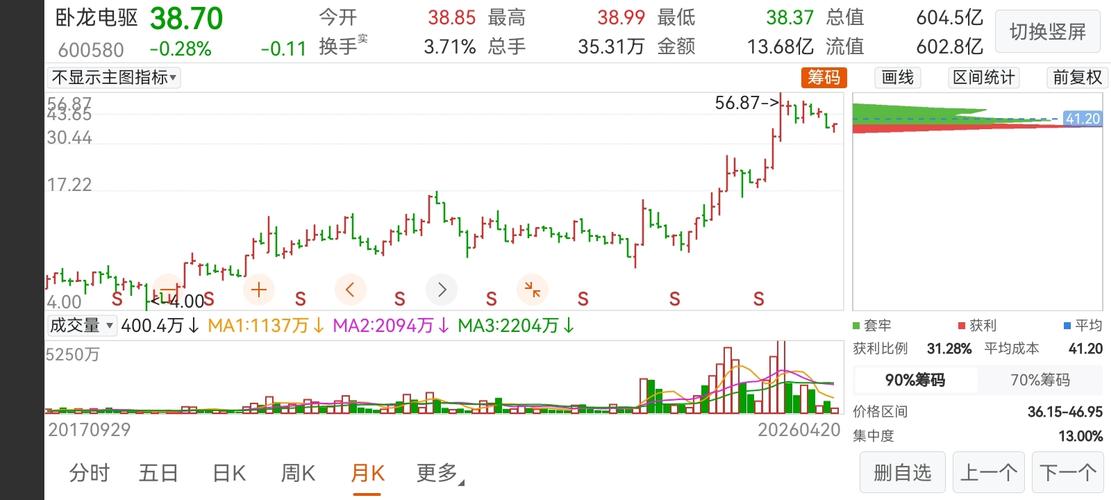 $卧龙电驱(SH600580)$ 卧龙电驱(600580)最新行情(截至2026-04-20收盘) 收盘价:38.70元 涨跌:-0.11元(-0.28%) 今开/最高/最低:38.85/38.99/38.37元 成交量:35.31万手 成交额:13.68亿元 换手率:2.27% 总市值:604.54亿元 市盈率TTM:53.68倍 近期走势(4月) 短期(4月):震荡企稳,在37~39元区间窄幅...
