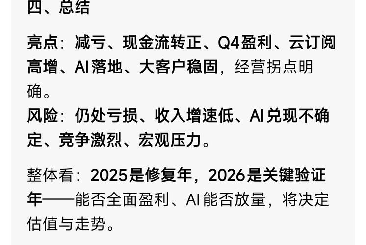 持仓用友500天以上了,先说结论,今年看好。个人几点总结,利空利好各做一下总结: 偏利空:1.扣非净利润来看有点不及预期,4季度把净利润硬拉上到盈利,一季度较惯例应该还是亏损,主要看亏损金额。 偏利好:应收款余额已出现拐点,如果进一步压降,特别是前期计提坏账的应收款收回,从信用减值角度看,2026的账面净利润将上升。 中性:目前用友BIP高级版旗舰版都在用,不算好用,但是大客户粘性很高,切换一次太...