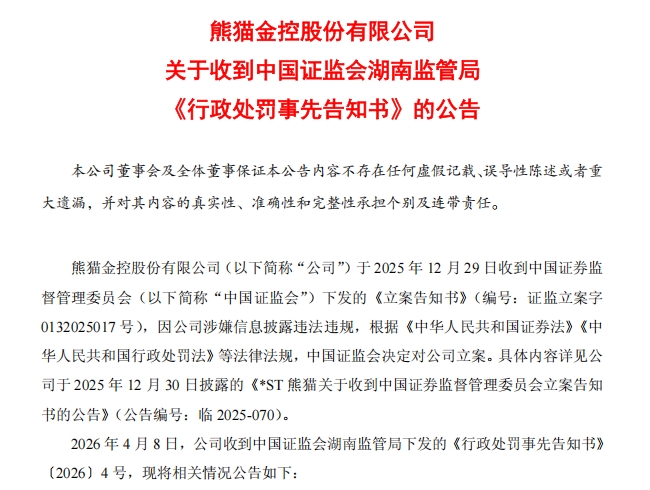$*ST熊猫(SH600599)$熊猫金控提起锁定退市,虚假债权处置被处罚。上海古北事务所娄霄云提示,2023年4月4日到2025年4月27日期间买入并且现在还持有的了解工号更多,谈虚道长,合规登记。同日,利安达会计师就审计程序执行情况、审计工作进度及相关事项回复称,将对公司2025年度财务报告出具无法表示意见,内部控制审计报告出具否定意见。