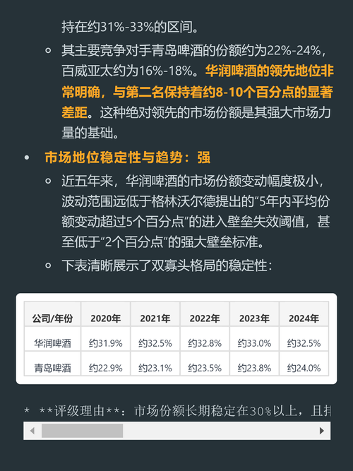 $华润啤酒(HK|00291)$$青岛啤酒(SH600600)$$燕京啤酒(SZ000729)$很多人觉得啤酒是门槛极低的快消品,其实华润啤酒的护城河,已经硬到新玩家根本挤不进来。 中国啤酒行业早就整合完了,是华润和青岛双雄主导的寡头市场。 华润的销量份额连续五年稳坐第一,常年在31%-33%区间,比第二名青岛啤酒高8-10个百分点,五年份额波动不到1个点,远低于5%的壁垒失效阈值,现有玩家根本撼...