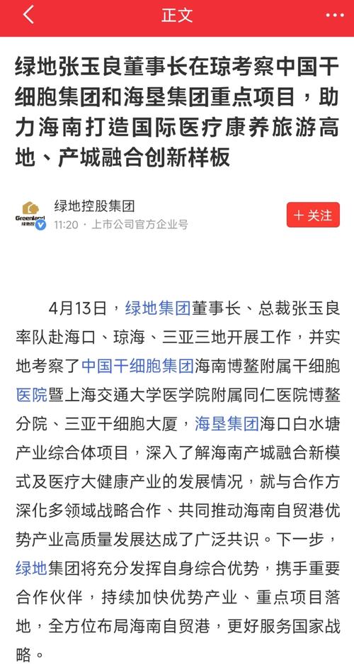 $绿地控股(SH600606)$绿地张玉良董事长在琼考察中国干细胞集团和海垦集团重点项目,助力海南打造国际医疗康养旅游高地、产城融合创新样板
