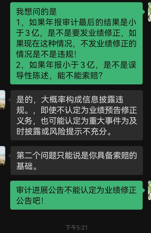 $*ST国化(SH600636)$ 专业律师的回复,前面的2份审计进展公告不能替代业绩修正公告,但是他把风险点隐藏在审计进展里了,后期业绩不达3亿,会被认定风险提示不充分,如果后面的时间不发业绩修正预告,以央企背景的管理模式,合规概率在八成以上!兄弟们可以冲上来救我了!还差5.5个板!