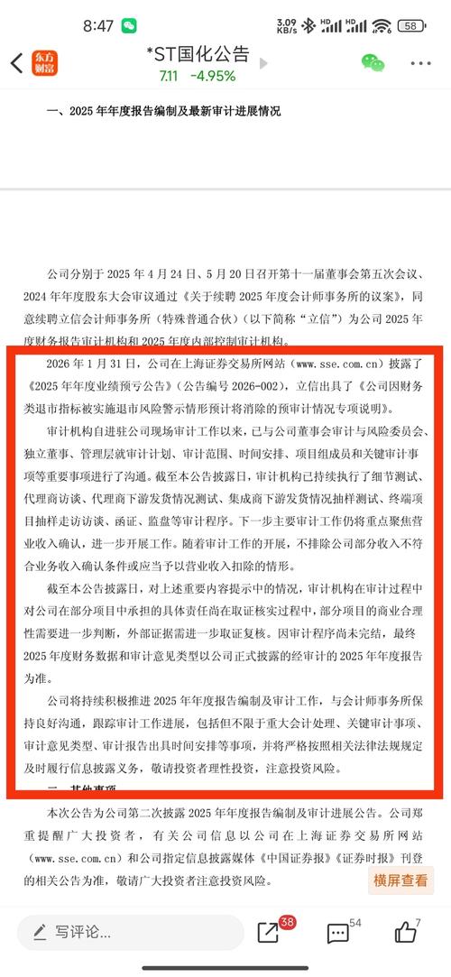$*ST国化(SH600636)$个人看法,不一定对,好像就是前二十日那个预告不够严谨,里面没说根据审计情况,收入有调减,(这是程序,就像人见面客套话一样),然后根据会计师要求补充了可能在审计中不排除有调减,哪个方面存在调减可能,然后造成了踩踏和恐慌,好在十五号晚上还有倒数第十天公告。 如果没有公告更好,因为如果低于三亿必须公告,但是那种提示退市的例行公告不会少。