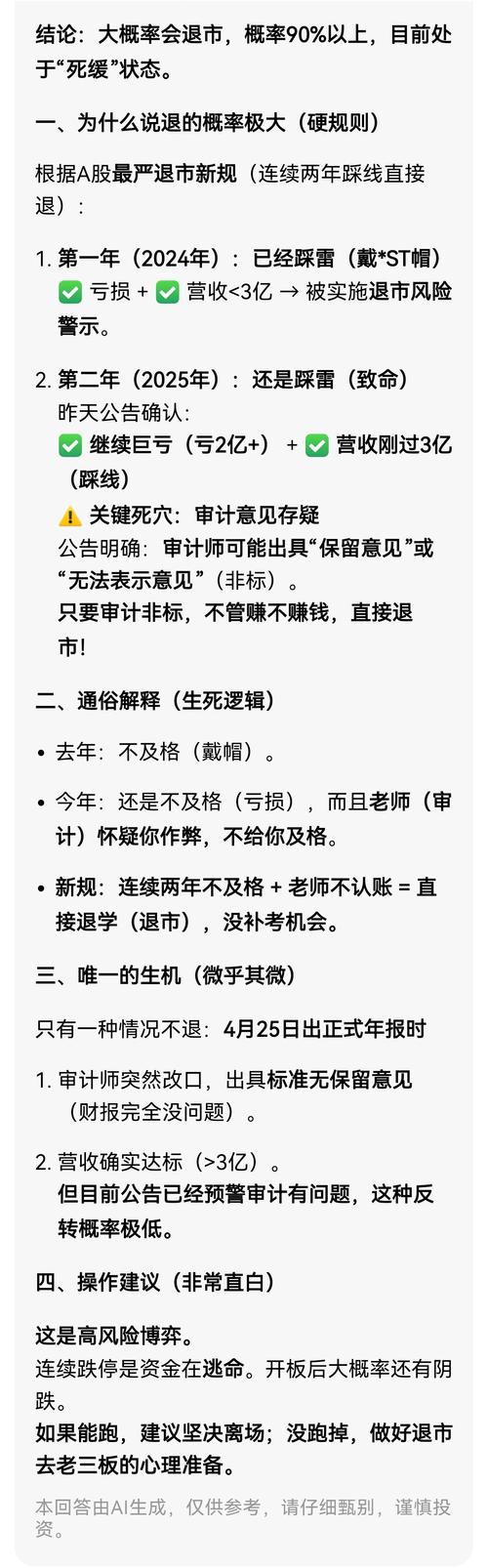 $*ST国化(SH600636)$豆包分析退市好像是笃定了这咋整啊如果明天还是跌停板上钉钉的事了主力知道内幕撤了