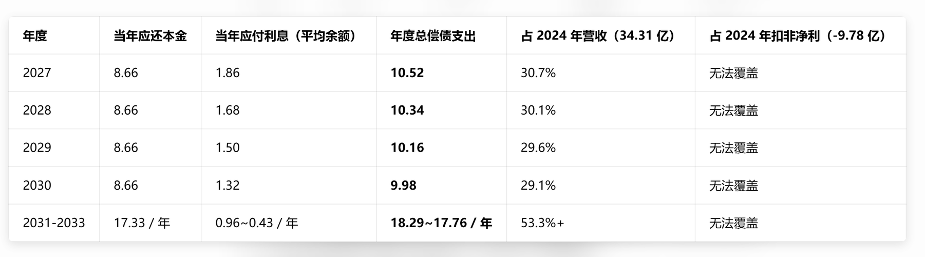 一.核心还款规则 24年债务重组方案留债总额:86.64亿元(有财产担保债权留债,10年期,2024.7.1-2033.12.31) 还款节奏:前3年(2024-2026)只付息、不还本;2027-2030(第4-7年)每年还10%本金;2031-2033(第8-10年)每年还20%本金 利率:基准2.15%/年(5年期LPR下浮180BP,最低不低于2.15%),2027年起逐年小幅上调 年度还...