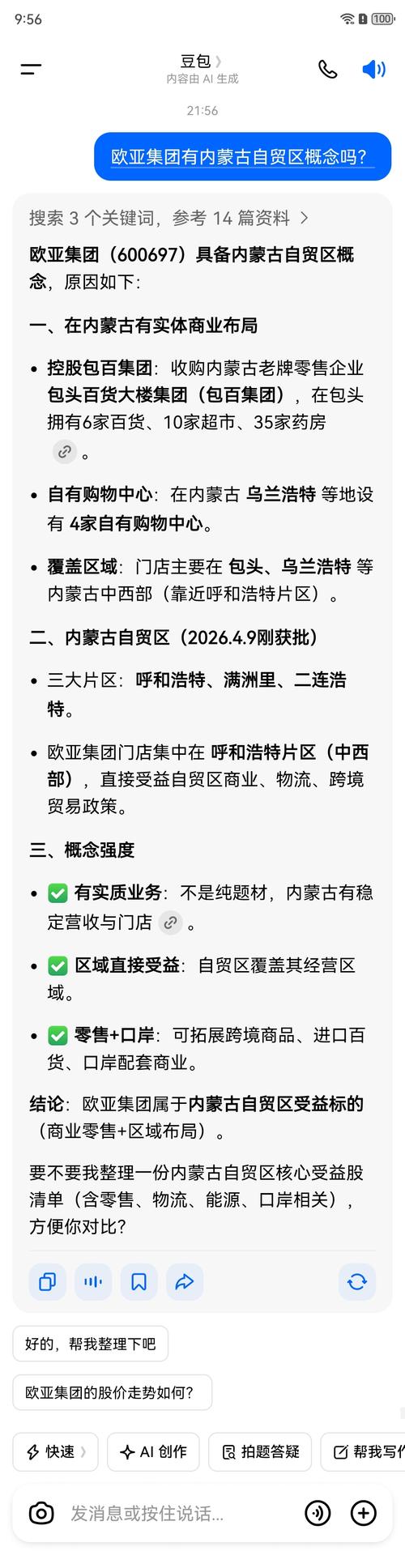 $欧亚集团(SH600697)$问了豆宝,欧亚集团沾了点概念