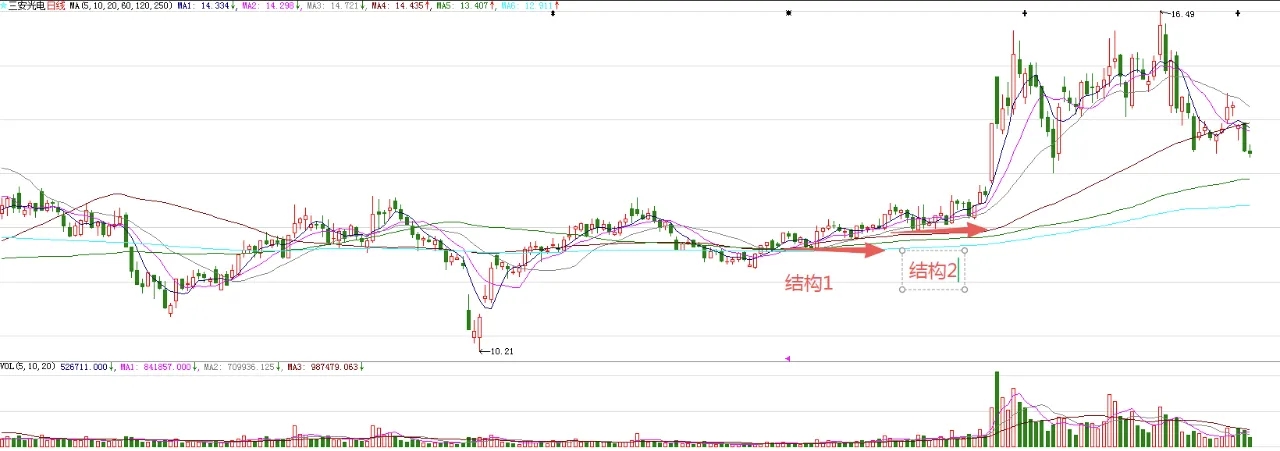 $三安光电(SH600703)$ 今天小幅度震荡,收出十字星,短线释放了企稳信号。下周初股价大概率企稳回升。正常情况下,这里会成为中期调整结束的位置。极端情况下,会稍微再下探一些。图中标注的结构1和结构2突破,意味着股价处在上涨趋势。近期的调整,是这个阶段的典型调整,后期大概率还有波段上涨。