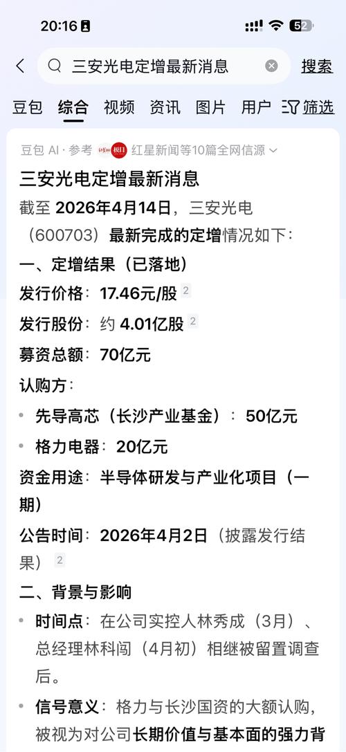 $三安光电(SH600703)$三安光电4月2日定增募资完成的消息怎么没有报岀来?搞笑了吗?说明了什么? 一、2026年最新定增(已完成) 发行结果公告日:2026年4月2日 募资总额:70亿元发行价:17.46元/股 发行股份:约4.01亿股 认购方:先导高芯(长沙国资背景):50亿元格力电器:20亿元用途:投向半导体研发与产业化项目(一期)二、近期背景(2026年3月) 3月下旬:公司实控人林...