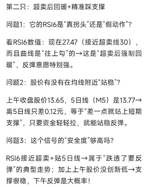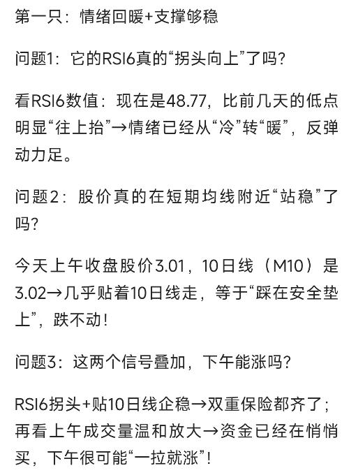 #社区牛人计划#$建元信托(SH600816)$$三安光电(SH600703)$$杉杉股份(SH600884)$ 上午收盘想找下午能涨的票,“RSI6拐头向上+股价贴短期均线企稳”是最靠谱的“抄底信号”! 别急着翻行情,先把这两个关键细节拆明白——毕竟信号看对了,吃肉才稳! 第一关:先把“RSI6+均线企稳”拆透(每个问题都藏着赚钱逻辑) 问题1:RS...