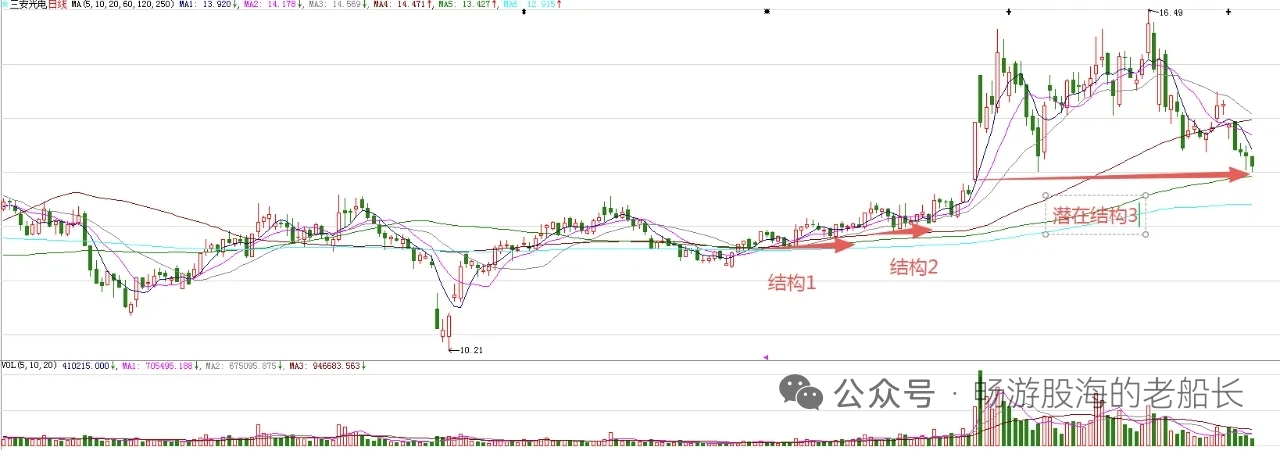 $三安光电(SH600703)$ 小幅度调整,回补了昨天的下影线。最近两个交易日的K线,构成了企稳型组合。周期来看,今天是第五个有效周期,是变盘节点,虽然没有直接上涨,但是走出了企稳信号,也是正常的。调整,也到了震荡区间的下轨,空间也到了。图中标注的结构1和结构2突破,意味着股价处在上涨趋势。接下来,股价逐步走出低迷,走波段上涨是大概率事件。