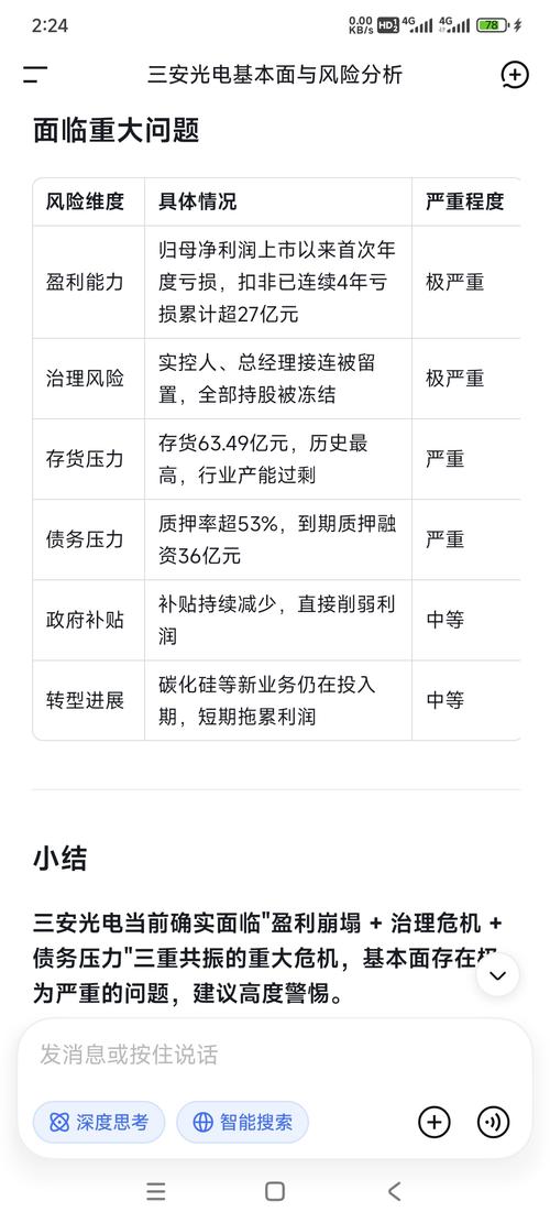 $三安光电(SH600703)$本来看macd马上要反转了想建仓,问ds总结了一下近期公司基本面感觉还是算了……确实问题有点多,而且都不是短期能改善的样子。