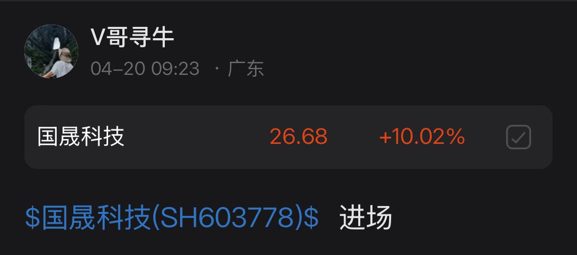 2.20早盘持仓总结:$国晟科技(SH603778)$今天早盘将该股分享出来并且同时进场成功吃上涨停,恭喜各位同车的朋友们吃肉。$三安光电(SH600703)$今天早盘选择进场早盘浮动不是很大继续拿着,期待下午表现。$神剑股份(SZ002361)$上周五尾盘进场今天也是成功拿下收益继续格局,各位同车的等我通知