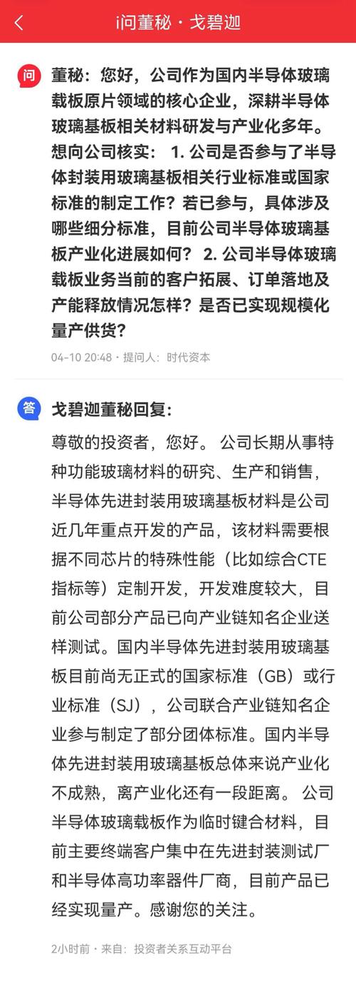 二者虽同属玻璃基板领域,但赛道、技术路线、商业化阶段完全不同,不存在直接竞争关系,核心差异拆解如下: 一、赛道定位与核心业务的本质区别 戈碧迦 它的核心赛道是半导体先进封装用玻璃基板/载板原片,是国内少数深耕半导体级玻璃材料的企业,产品直接服务于AI芯片2.5D/3D封装、HBM高带宽显存、TGV玻璃通孔等前沿工艺,属于半导体产业链上游的“硬科技材料”环节,也是当前国产替代的稀缺标的。 彩虹股份 ...