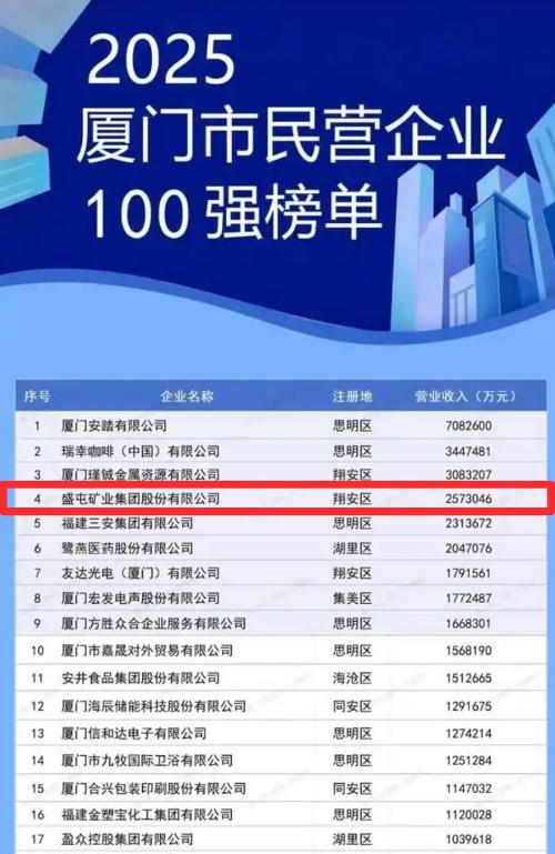 $盛屯矿业(SH600711)$ 11月1日在2025厦门企业家日大会上2025厦门市民营企业100强榜单发布 位于榜单前四的依次为:厦门安踏有限公司、瑞幸咖啡(中国)有限公司、厦门瑾铖金属资源有限公司、盛屯矿业集团股份有限公司 同时出炉的还有“制造业50强”,盛屯矿业集团股份有限公司位居榜首;“服务业50强”,厦门安踏有限公司位居榜首;“科技创新50强”,厦门市九牧国际卫浴有限公司位居榜首。和去...