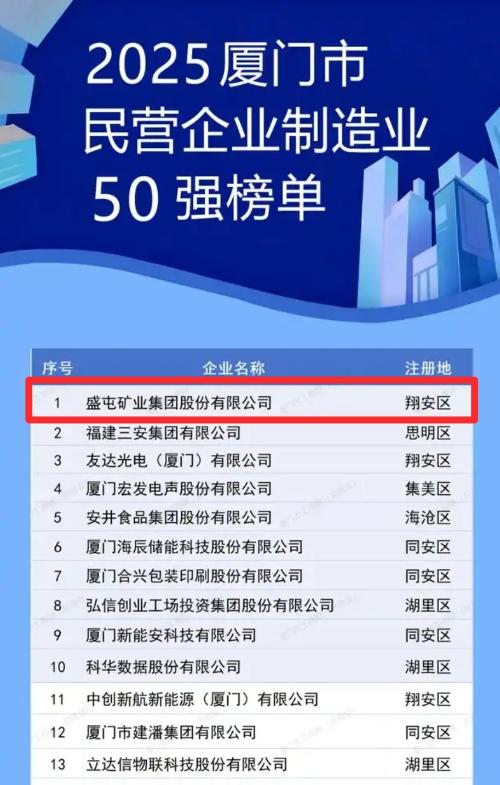 【20251102喜报】盛屯矿业勇夺2025厦门民营企业制造业50强榜首、2025厦门民营企业100强第四