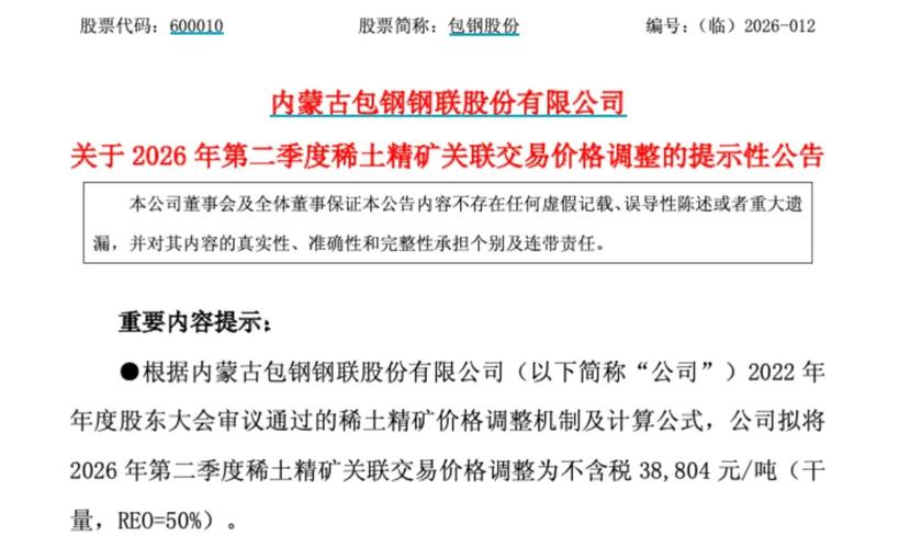 包钢股份(600010)发布《关于2026年第二季度稀土精矿关联交易价格调整的提示性公告》,公告显示,公司拟将2026年第二季度稀土精矿关联交易价格调整为不含税38804元/吨(干量,REO=50%)。 同日,北方稀土(600111)亦发布相关公告,2026年第二季度稀土精矿交易价格调整为不含税38804元/吨(干量,REO=50%),REO每增减1%、不含税价格增减776.08元/吨。