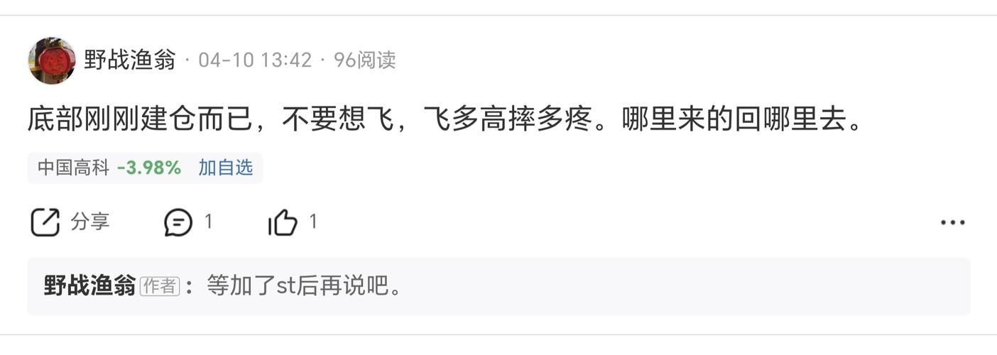 $中国高科(SH600730)$我发了很多篇年报风险注意提示了,这里再发一遍,大A大部分公司都有问题所以年报前清仓年报后买入规避风险,总不能硬顶监管吧,而且最坏的就是有些公司明知道利好反而故意st吓走散户的有什么办法,包括去年的亚振家居我们4块钱呼吁建仓的就一个st大家就全跑了,你不走他就故意退市跌到1毛钱收割你,你走了他就重组成功涨到40,都是看对手盘操作而已,拿它没办法的。