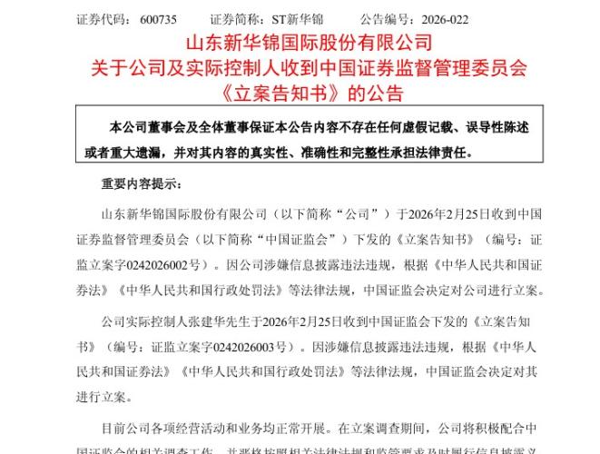 最新《立案告知书》说明什么?证监会一般在掌握较为充分证据后,才会进行立案调查,维权时间节点至关重要!符合以下任意一种情况的可参加索赔:1、2025年8月26日之前买入600735新华锦,且在2025年8月27日(含当日)之后卖出或继续持有者 2、2026年2月25日之前买入600735新华锦,且在2026年2月26日(含当日)之后卖出或继续持有者。以上索赔登记条件仅代表证威律所观点。不作为任何证券...