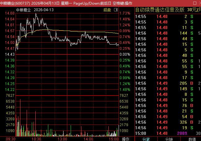 今日复盘分享,从4月3号开始一直到今天4月16号,一直在14到14.6之间洗盘震荡,今天16号出现第一次试盘破14.6的第一个压力位,成交量放小量不大,资金呈现小资金即可拉升,暗示大资金所需筹码已经足够(小说有3个亿的资金筹码了),变量选择方向迫在眉睫,在接下来的时间里,请各位散户朋友们只买不卖,跟着走,我期待着4个涨停板的到来。