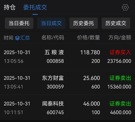 大妈夏洛特玲玲 更新于 今天 01:07 3243次浏览 今天浮盈8266元。做了三笔操作,清空了$东方财富(SZ300059)$和$闻泰科技(SH600745)$用于买入$五粮液(SZ000858)$,我依旧认为泸州老窖和五粮液当前股价的差异存在套利空间,所以暨昨日换入300股之后,今天又加多了200股。但我能做到的也不多,这两者的主仓依旧是泸州老窖。 #炒股日记# 278