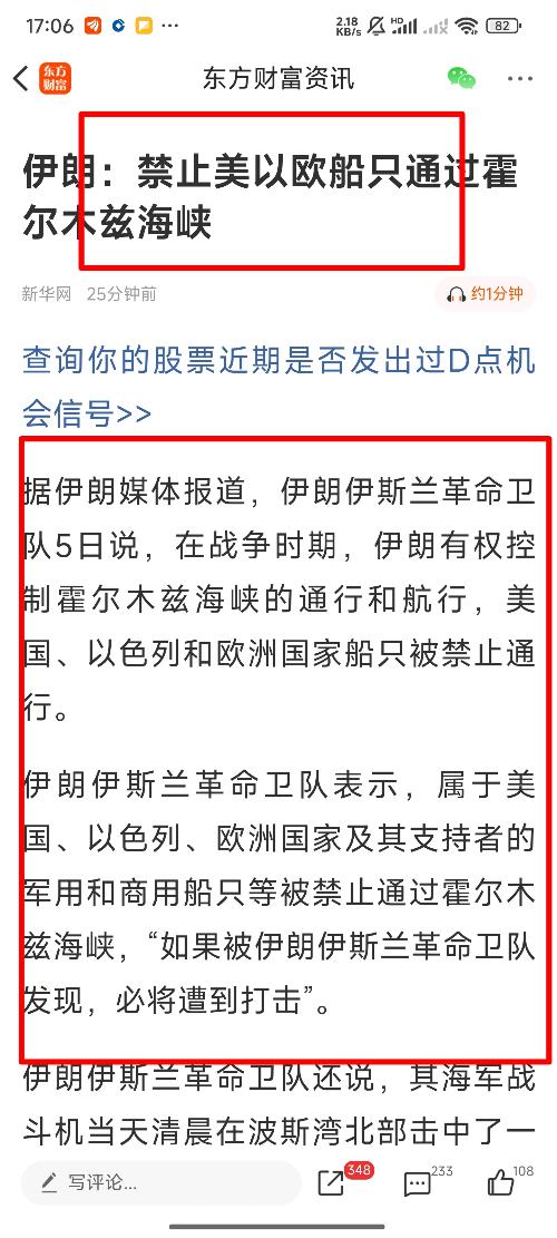 大A油气股的预期彻底没了,中国油气运输船可以正常通过海峡,中国威武! --------------------------------------- 伊朗方面此前已表示,根据相关国际法规和决议,在战争时期,霍尔木兹海峡的通行规则将由伊朗方面掌控。 声明还称,美国、以色列以及欧洲国家及其支持者所属的军用和商用船只,均严禁在该海域通行,一旦被发现,将遭到打击。