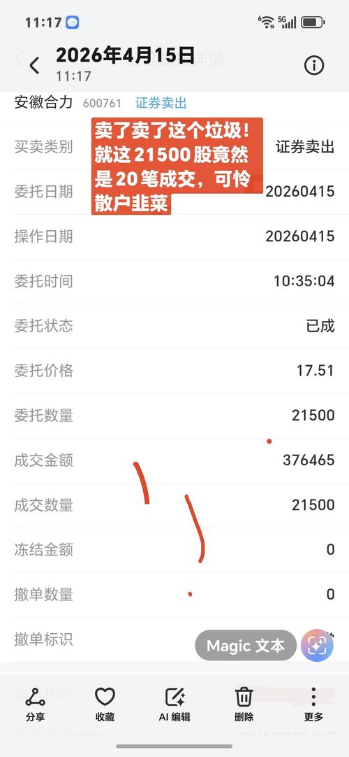 $安徽合力(SH600761)$17.51卖了!20笔交易买入,散户韭菜