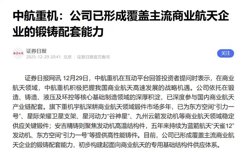 $中航重机(SH600765)$中航重机旗下重机宇航已为东方空间“引力一号”、星际荣耀卫星支架等供应关键锻件;安吉精铸则聚焦发动机高温结构件,为蓝箭航天“天雀12”发动机、东方空间“引力一号”等提供高性能铸件。