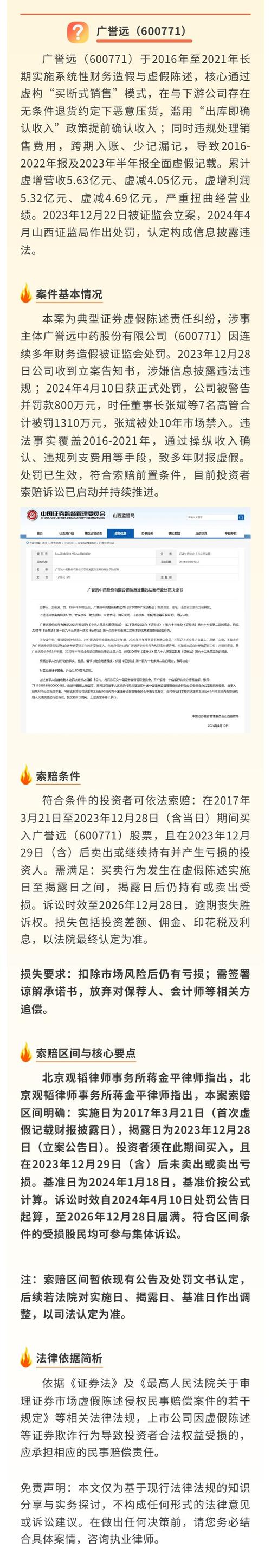 于2017年3月21日至2023年12月28日(含当日)期间买入,并于2023年12月29日及之后卖出或持有广誉远(600771)股票而亏损的投资者,均可提出挽损