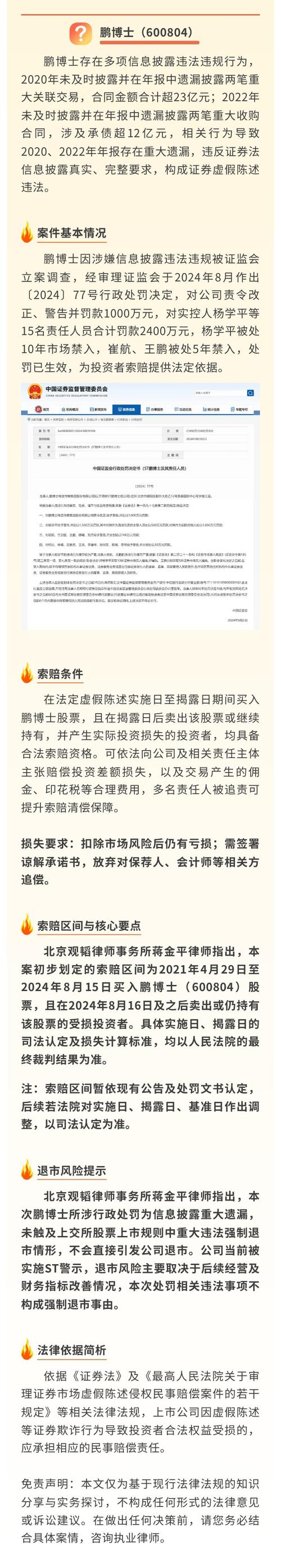 $退市鹏博(SH600804)$鹏博士(600804)因涉嫌信息披露违法违规,已收到证监会行政处罚决定书,受损股民可依法维权。 索赔条件明确:2013年4月12日—2023年7月17日买入,2023年7月18日(含当日)后卖出或持有该股票的投资者。 索赔时效截止2026年7月17日,逾期将丧失胜诉权。谢保平律师团队提供免费资格核验、全程案件跟进,坚持不成功不收费,助力股民挽回投资损失。 最终以法院...