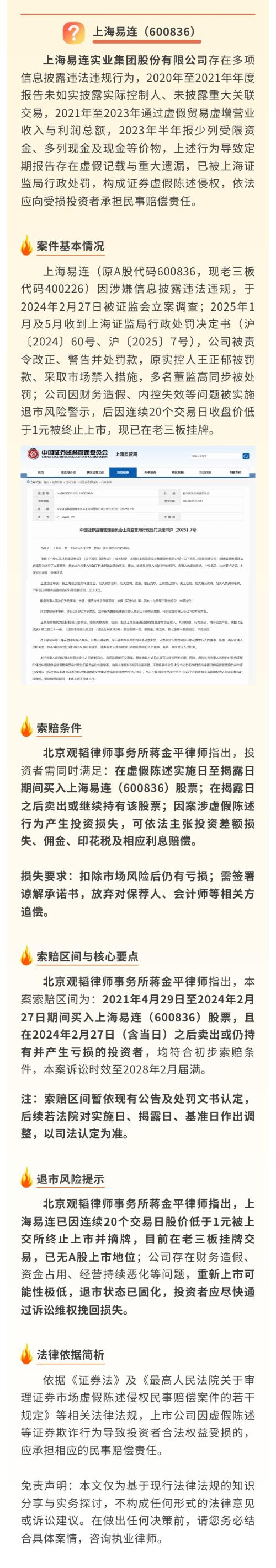 信披违法受处罚。 目前,章祥兵律师正在代理上海易连受损投资者索赔诉讼工作。索赔条件为: 在2021年4月29日至2024年2月27日期间买入上海易连股票,且在2024年2月27日收盘时仍持有该股票的受损投资者,可以起诉索赔损失。 最终索赔条件以法院认定为准。 符合索赔条件的投资者,请尽快联系上海博爱方本律师事务所章祥兵律师团队。