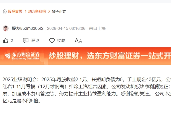 2025业绩说明会:2025年每股收益2.1元,长短期负债为0,手上现金43亿元,公司扣非净利润本为正。亏损主要系上汽红岩1-11月亏损(12月才剥离)扣除上汽红岩因素,公司发动机板块净利润为正;公司将继续加强发动机业务的市场拓展,加强成本费用管控等,努力提升主业持续盈利能力。感谢您的关注。公司本业三种主业都飞速正长。资本公积金66亿元是股本的5倍。