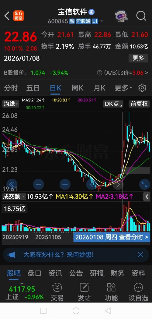 $宝信软件(SH600845)$收盘最低价,刚好是1月8日的涨停价,是巧合还是阴谋,还是故意的,还是随意的,大家发飙一下吧,预测周一是不是大面积低开,要是真是这样,这一轮主力拉升的筹码已经崩不住了,是不要要来个大逃亡或者是大反转,还是大撤退还是横盘整理一万年,大家再次发飙一下,谢谢,反正这一周我跌懵呢,猪猪跌去了10%的利润,还是去年刚回本恩钱,我的老天啊,完事了吗?黄金回调你倒是跟得很紧啊,咋是...