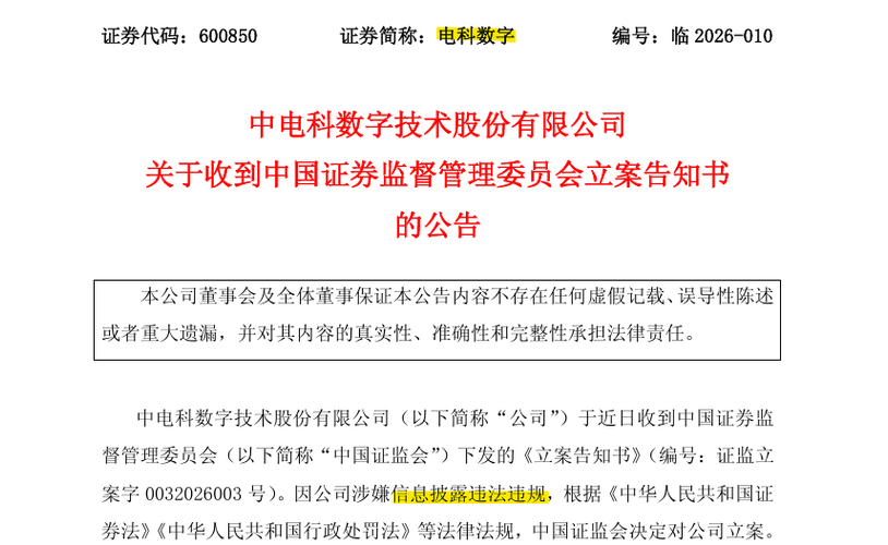 电科数字(600850):首次因涉嫌信披违法违规被立案,立案后股价跌停
