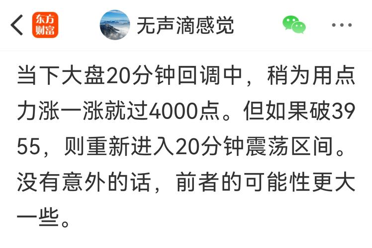 4000!大盘刚刚向上突破并进入20分钟第三波。能够再次跨过4000点,证券功不可没。其中哈投证券、中信证券、东方财富、华泰证券等大幅上涨,一扫往日的颓势。没有想到吧,大盘会以这样的方式上攻,主力这是动用了雪藏的秘密武器。 昨天讲:“大盘20分钟回调中,稍为用点力涨一涨就过4000点。但如果破3955,则重新进入20分钟震荡区间。没有意外的话,前者的可能性更大一些。” 在很多人无所适从而彷徨之际,...