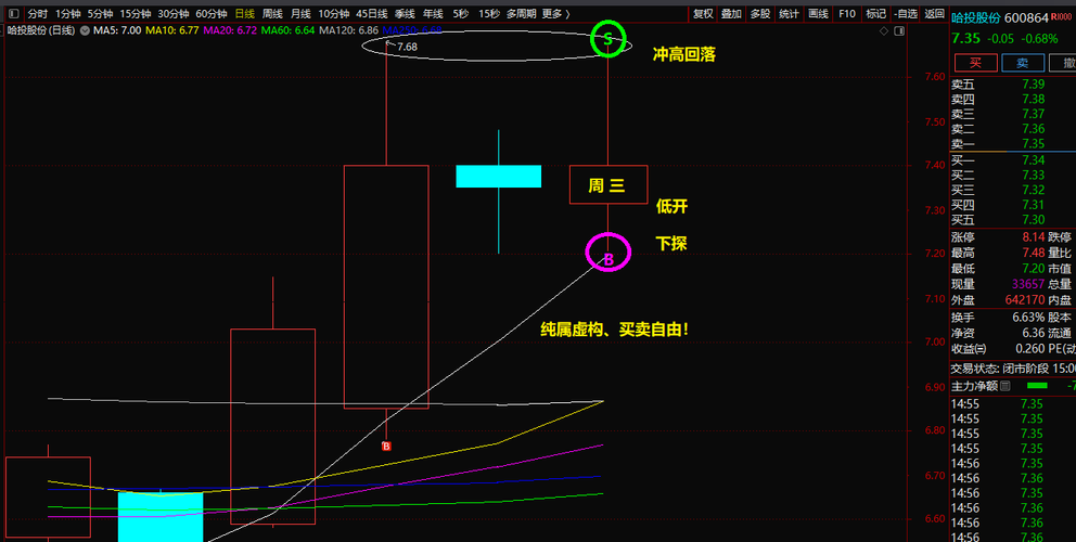 哈投股份,尾盘强行拉升放量刚好10个亿,是昨天成交量的一半,这是主力震仓标准手法。本周3天安心持有即可,别轻易做T,主升阶段大部分技术指标都会失效,主力资金说了算,很容易就会T飞。明天早上低开,十点半附近考虑卖出。