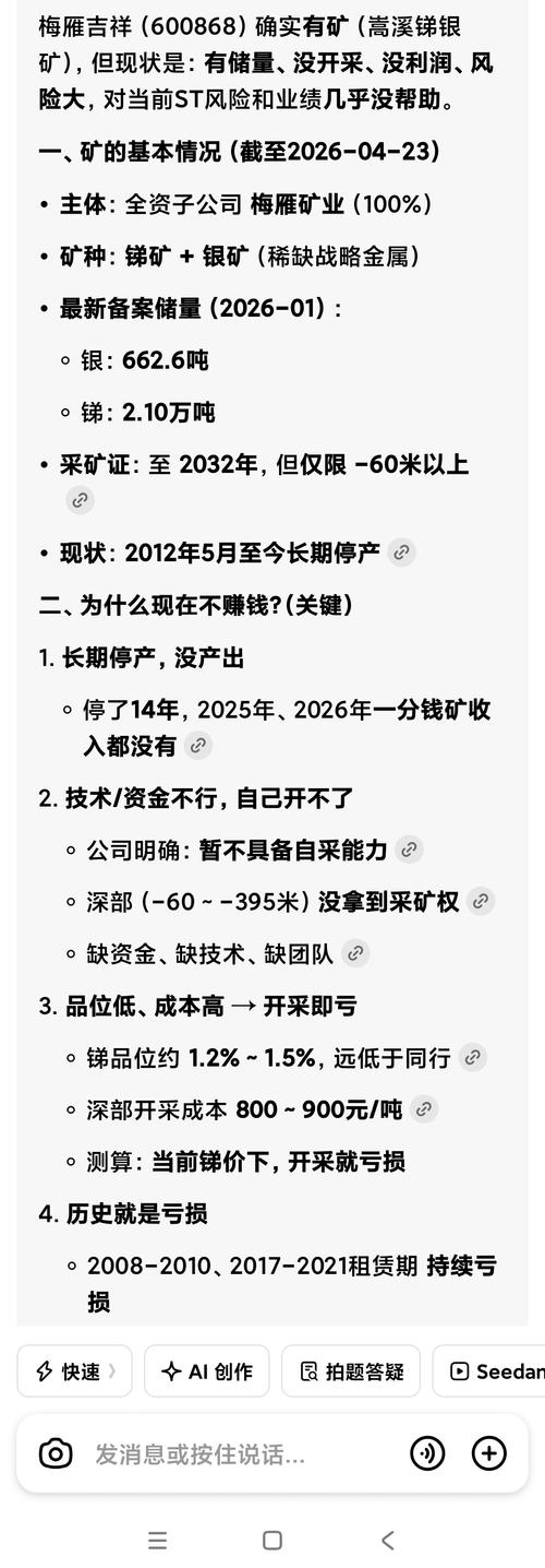 $梅雁吉祥(SH600868)$ 思考过程: 好的,我现在需要回答用户关于梅雁吉祥矿业银锑矿石品位及矿石储量,以及扩大矿山开采深度的进展问题。首先,我需要从提供的检索信息中找到相关数据。 首先看专业数据库数据中的[4],提到梅雁吉祥拥有嵩溪锑银矿,采矿许可证有效期至2032年5月。但这里没有具体的品位和储量数据。接下来查看公司公告,[7]和[8]详细描述了资源储量的情况。例如,[7]提到采矿权范围...