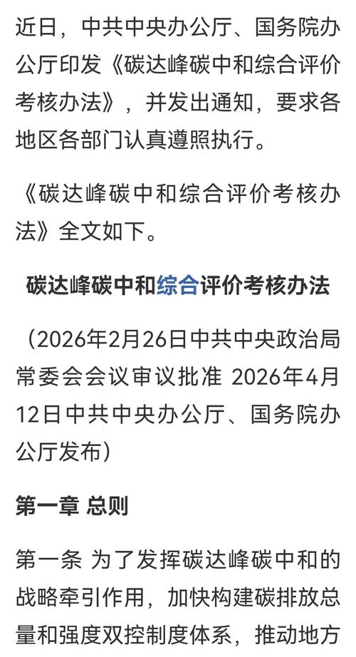 $梅雁吉祥(SH600868)$ 近日,中共中央办公厅、国务院办公厅印发《碳达峰碳中和综合评价考核办法》,并发出通知,要求各地区各部门认真遵照执行。 《碳达峰碳中和综合评价考核办法》全文如下。 碳达峰碳中和综合评价考核办法 (2026年2月26日中共中央政治局常委会会议审议批准2026年4月12日中共中央办公厅、国务院办公厅发布) 第一章总则 第一条为了发挥碳达峰碳中和的战略牵引作用,加快构建碳排...