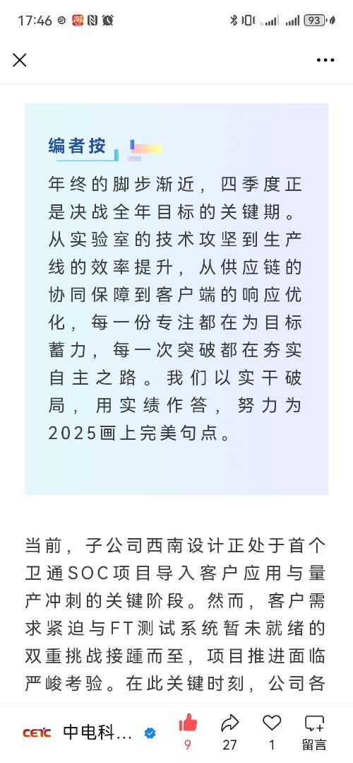 $电科芯片(SH600877)$卫星端侧之王。玩卫星的,埋伏朱雀3的,不买他都是研究没入门。卫星产业链应用端最牛的标。1、手机低轨卫星soc芯片mate80独供,国内做这个的有四五家吧,只有电科实现了量产,其中有个关键问题其他家解决不了,电科解决了并率先实现了量产。除了菊花,还有其他手机大品牌跟进了这个方案,这个0-1的增量会超出二级市场的想象。2、上市公司主业汽车模拟芯片,公司坐落在汽车电子城重...