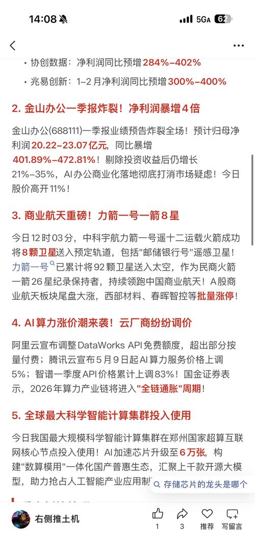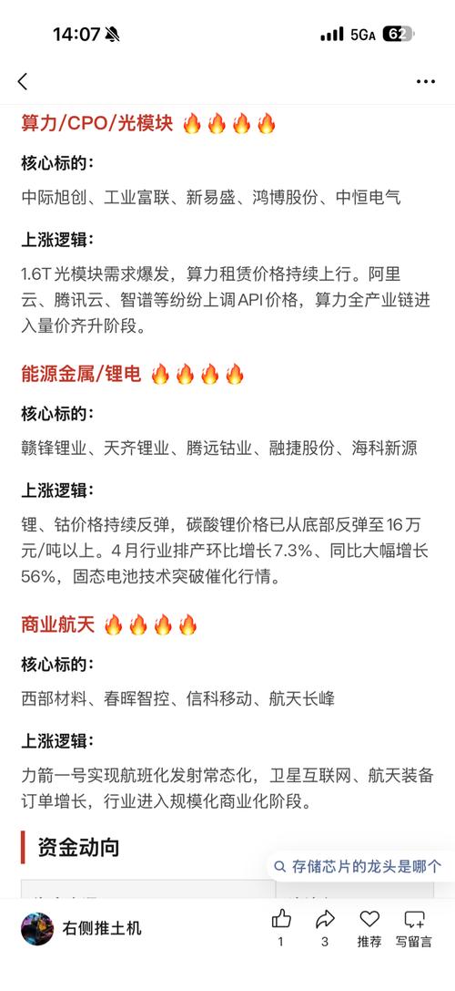 $电科蓝天(SH688818)$$航天电子(SH600879)$$大元泵业(SH603757)$重点板块梳理半导体/存储芯片核心标的:协创数据、佰维存储、江波龙、德明利、香农芯创、兆易创新、长电科技上涨逻辑:全球存储芯片进入涨价周期,TrendForce预测Q2DRAM涨价58%-63%、NANDFlash涨价70%-75%。三星、SK海力士持续提价,AI服务器对存储需求爆发,国产替代加速。算力/...