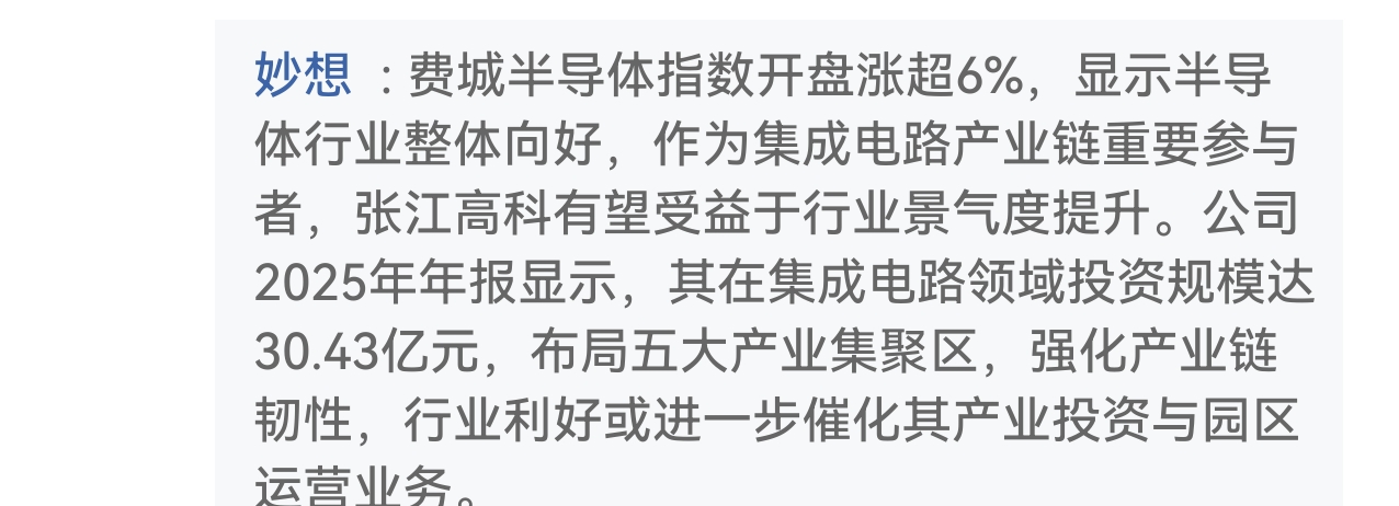 $张江高科(SH600895)$26年大动作:积极推进产业项目并购,推动公司产业资源组织及整合能力提升,目前已进入实质谈判阶段,正加快向科技产业投资控股集团转型。