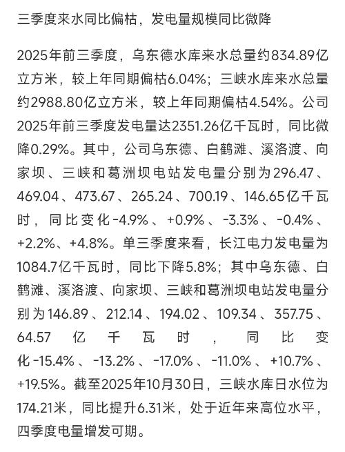 三峡工程整体竣工验收5周年之际,累计发电量突破4230亿千瓦时的数据引发关注。这一数字背后,折长江电力作为全球最大水电上市公司的运营现状。 从最新财报看,长江电力2025年前三季度实现归母净利润281.93亿元,同比增长0.60%。表面看似平稳的数据下,隐藏着来水偏枯带来的影响。数据显示,乌东德水库来水总量较上年同期偏枯6.04%,三峡水库来水总量偏枯4.54%。这一自然因素直接导致第三季度公...