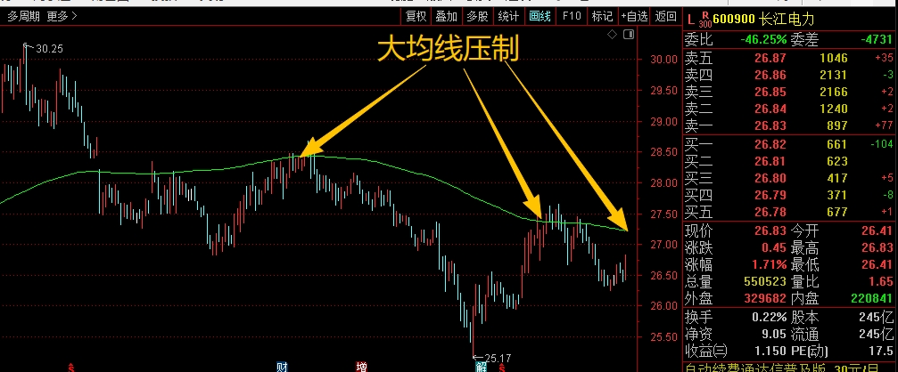 $长江电力(SH600900)$中期趋势相对是弱势的,主要是前期高位回落,跌破了大均线后,没能拉起来站稳,随后的调整一直都被大均线所压制,所以整体偏弱,短期来看,在没有重新站稳大均线并且形成向上趋势之前,都需要谨慎应对,不着急加仓,中期肯定没问题,但短期涨跌节奏不好把握,不追涨杀跌即可。